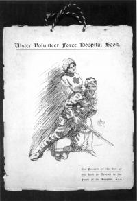 Images of the Great War were also being produced by William Conor in Belfast. Of the three artists he was certainly closest to ‘the people’. His vigorous and personable, if rather folksy, sketches of soldiers in the 36th (Ulster) Division were effectively uniformed versions of the tinkers and shipyard workers for which he subsequently became known. In so far as Ulster aspired to the ideal of ‘a nation in arms’ (if ‘nation’ it was), this was it. His pictures mostly dealt with the home front or soldiers training before they went overseas. They also record the role of women in the war effort, and included a commissioned painting of a female munitions worker at Mackies (the Belfast engineering works) and one of a nurse supporting (rather uncomfortably) a wounded soldier, which was used for an Ulster Volunteer Force Hospital fund-raising brochure. Reflecting a more conventional view of war service, however, in 1919 he exhibited a painting entitled The Glorious Dead.